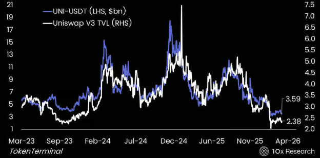 UNI-USDT 对比 Uniswap V3 TVL——DeFi 势头疲软