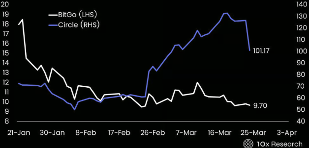 BitGo 对比 Circle——BitGo 在 IPO 后股价迅速下跌 50%