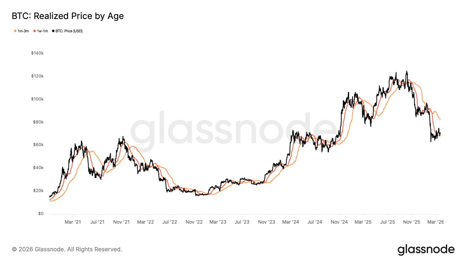 在前述供应动态的基础上,按持有时间划分的已实现价格分解提供了更为精细的视角,展示了不同投资者群体成本基础的分布情况。该指标追踪不同持有期限代币的平均购入价格,有助于从投资者行为角度界定近期的支撑与阻力位。