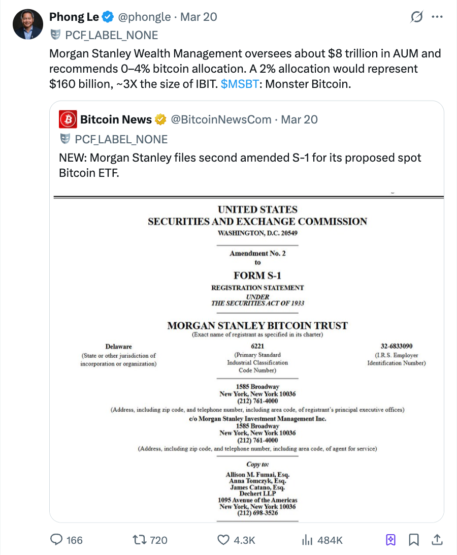 摩根士丹利在最新 S-1 修正文件中披露,其比特币现货 ETF「MSBT」管理费定为 0.14%,低于市场上所有现有竞争对手。若获 SEC 批准,MSBT 将成为首只由美国大型银行直接发行的比特币现货 ETF。该行旗下财富管理部门管理约 8 万亿美元客户资产,拥有约 1.6 万名财务顾问,Strategy CEO Phong Le 测算,仅 2%的配置比例即可带来约 1600 亿美元资金流入——相当于贝莱德 IBIT 规模的三倍。