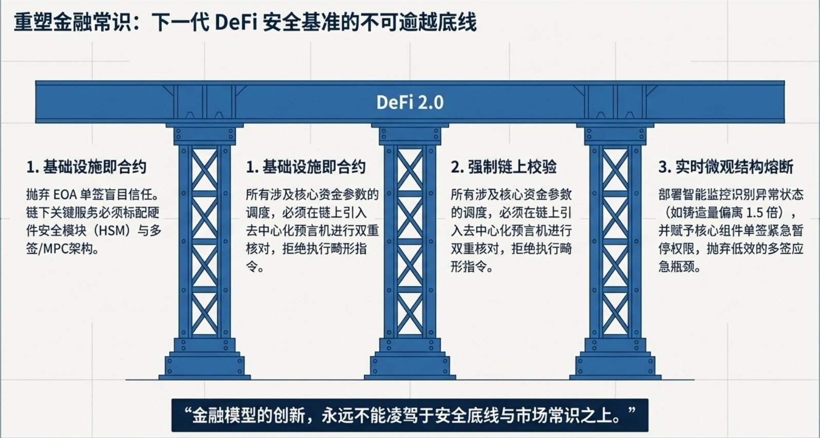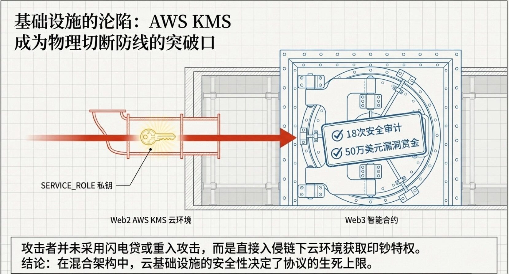 3.基础设施安全等同于合约安全:DeFi 协议继承了其所依赖的链下基础设施(如 AWS KMS)的所有漏洞。私钥管理绝不能依赖单一的 EOA 账户,必须采用硬件安全模块(HSM)和严格的多签机制。
