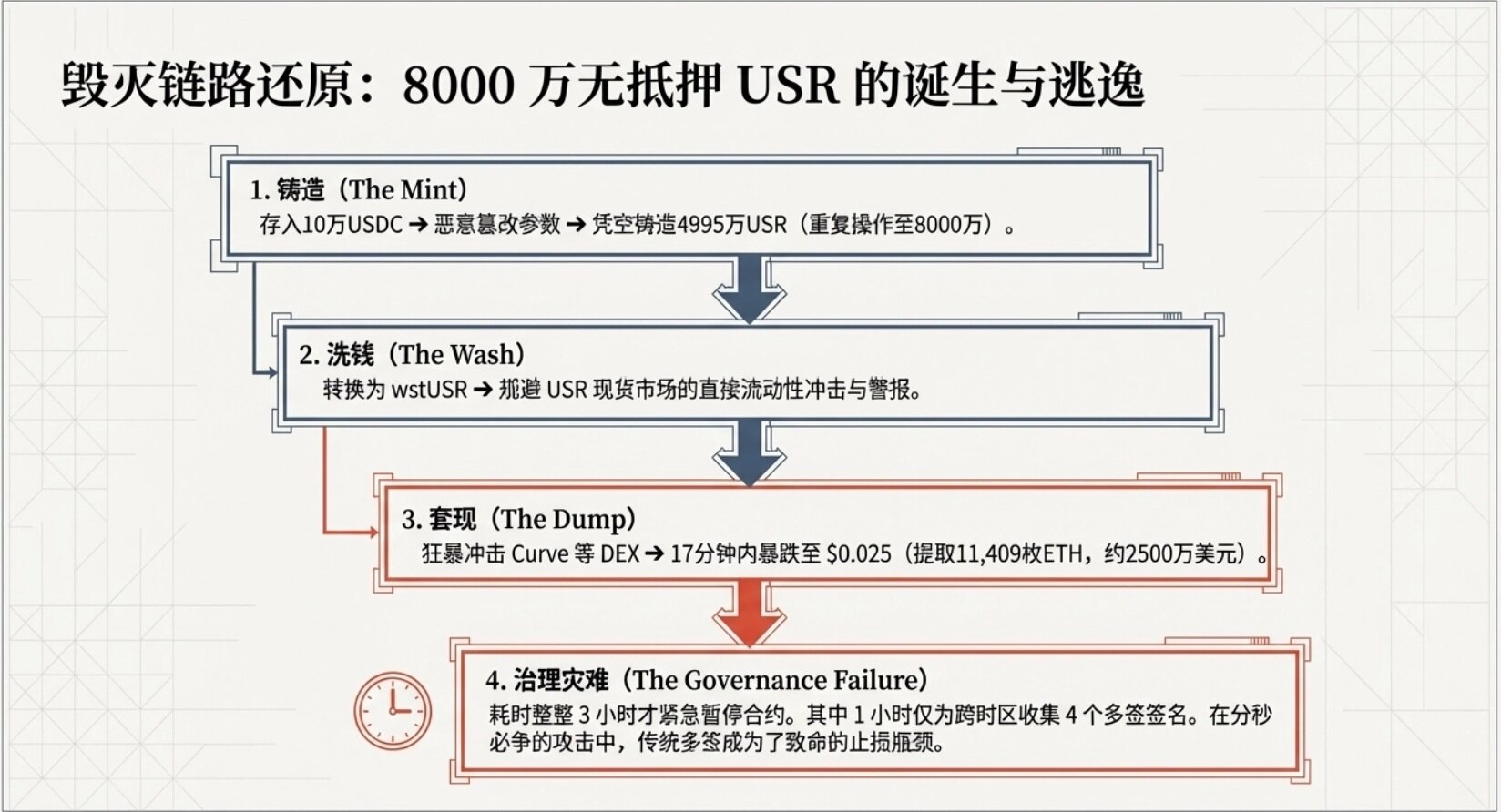 攻击者获取 8000 万 USR 后,先将大量 USR 转换为 wstUSR(Wrapped Staked USR)。wstUSR 是一种质押衍生代币,其价值代表了在质押池中的份额,而不是与 USR 固定 1:1 挂钩。通过这一中间步骤,攻击者成功规避了直接冲击 USR 现货市场的流动性约束,将巨大的抛压转移到了流动性较低但更具可替代性和隐蔽性的衍生品市场中。