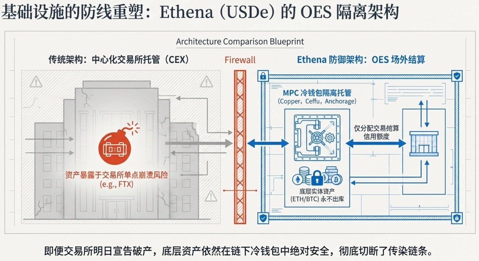 Ethena 破局的关键在于引入了场外结算架构。USDe 的底层抵押资产(ETH/BTC)并不存放在币安或 OKX 等交易所内,而是由受严格监管的第三方机构(如 Copper、Ceffu、Fireblocks 以及 2025 年底加入的 Anchorage Digital Bank)进行 MPC 冷钱包托管 。