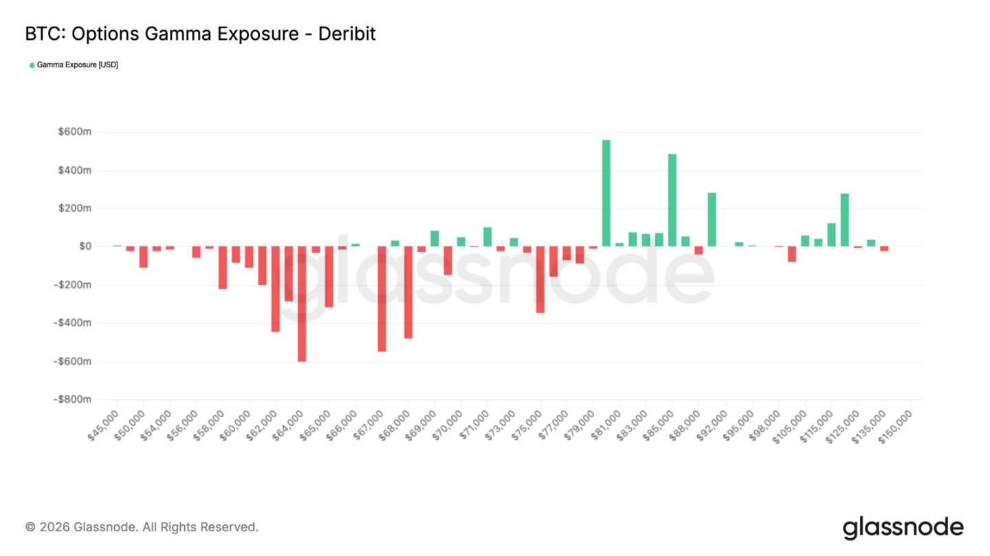 这种更具防御性的持仓结构,在对应到做市商的伽马敞口时会变得更加相关。负 Gamma 目前正在当前价格水平下方堆积,从 68,000 美元一直延伸到 50,000 多美元。这意味着,市场正在当前价格下方买入看跌期权,并且不预期近期的反弹行情能持续太久,这迫使做市商成为这些交易的对家。
