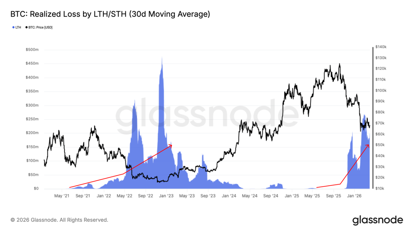该指标的 30 天移动平均线自 2025 年 11 月以来稳步上升,目前处于每日约 2 亿美元的高位。这证实了长期持有者正越来越多地向当前市场投降。虽然这波亏损实现是熊市出清过程中必要且具有建设性的一步,但仅凭它本身尚不足以构成市场反转的充分条件。该指标若能显著降温至每日 2,500 万美元以下的水平,将代表着卖方力量衰竭的更令人信服的信号,也是历史上在可持续牛市开启之前市场筑底的前提条件。