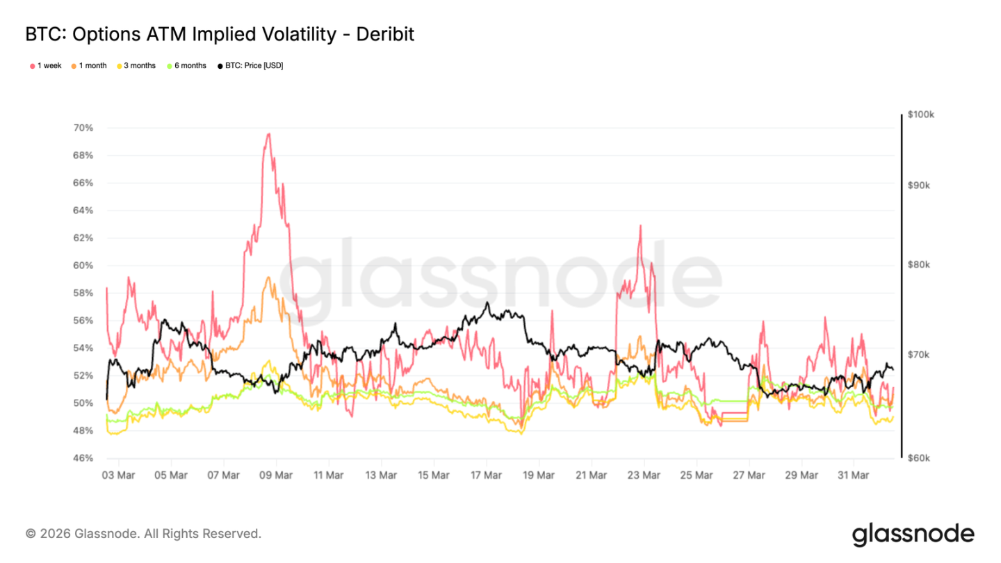 在期权市场持仓完成重置之后,隐含波动率是首先显现变化的地方。比特币的波动率期限结构相比上周整体下移,其中前端期限领跌。1 周期平值隐含波动率目前为 51%,3 个月期为 49%。其他期限的隐含波动率紧密排列其间,6 个月期为 49.8%,这指向一个显著压缩的期限结构。