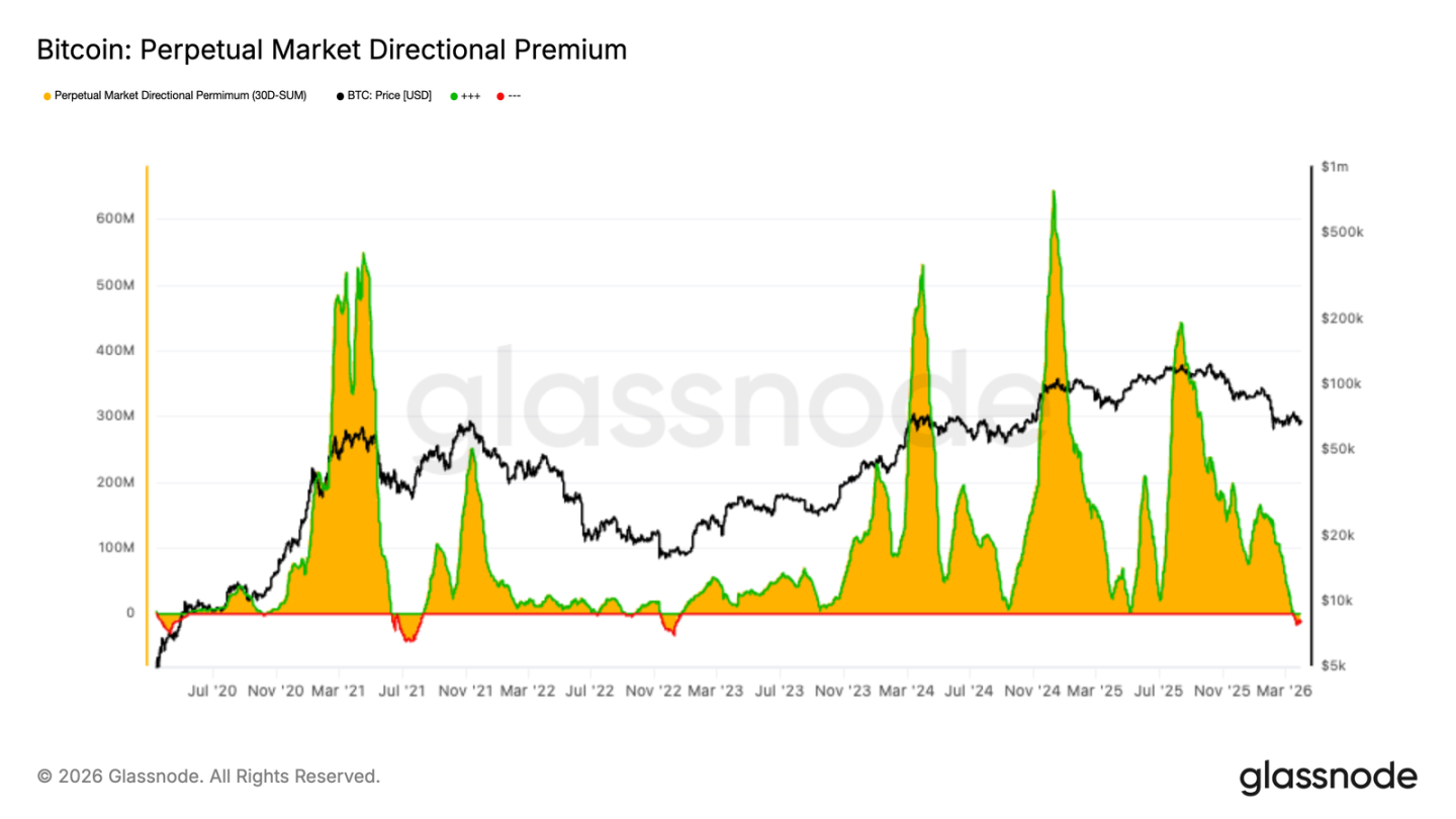 永续合约市场的方向性溢价继续压缩,30 天总和目前接近中性水平并略低于零。这标志着市场从此前支撑涨势的偏多条件中明显降温。