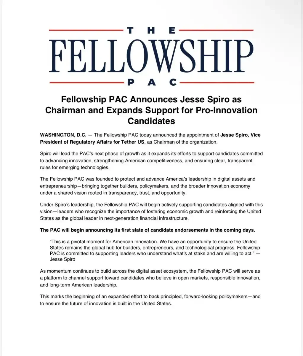 如今,一位现任 Tether US 高管正式出任 PAC 主席,此前的种种传闻终于落定为公开记录。据 BeInCrypto 报道,这是 Fellowship PAC 与 Tether 官方之间首次建立正式、公开的关联。