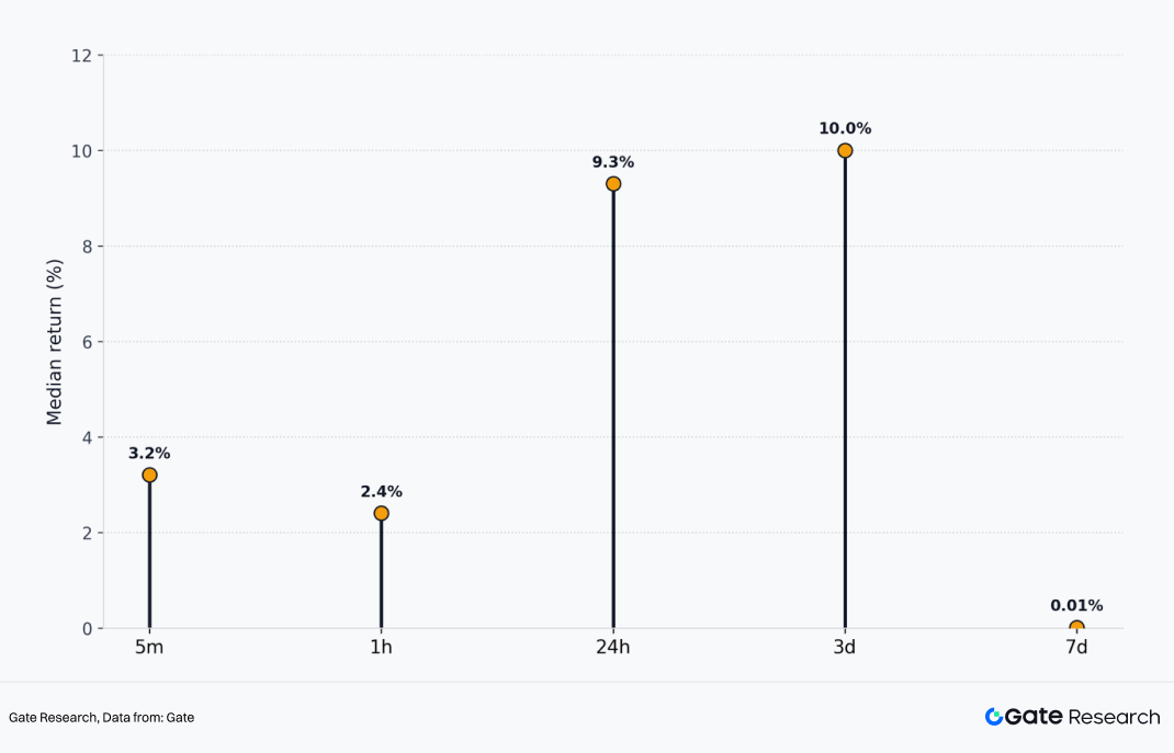Q1 新上线项目的中位数涨幅分别为:5 分钟 +3.2%,1 小时 +2.4%,24 小时 +9.3%,3 日 +10.0%,7 日 +0.01%。即使将极端高倍项目的影响放在一边,仅从样本中典型的项目表现来看,Gate 新币在 24 小时和 3 日阶段依然呈现出较明确的正收益状态,即 Gate 现货上币这一季度的整体表现,并不是只依靠极少数案例将平均值拉高,而是大多数项目在上市后的核心观察窗口中都具备一定正向收益基础。