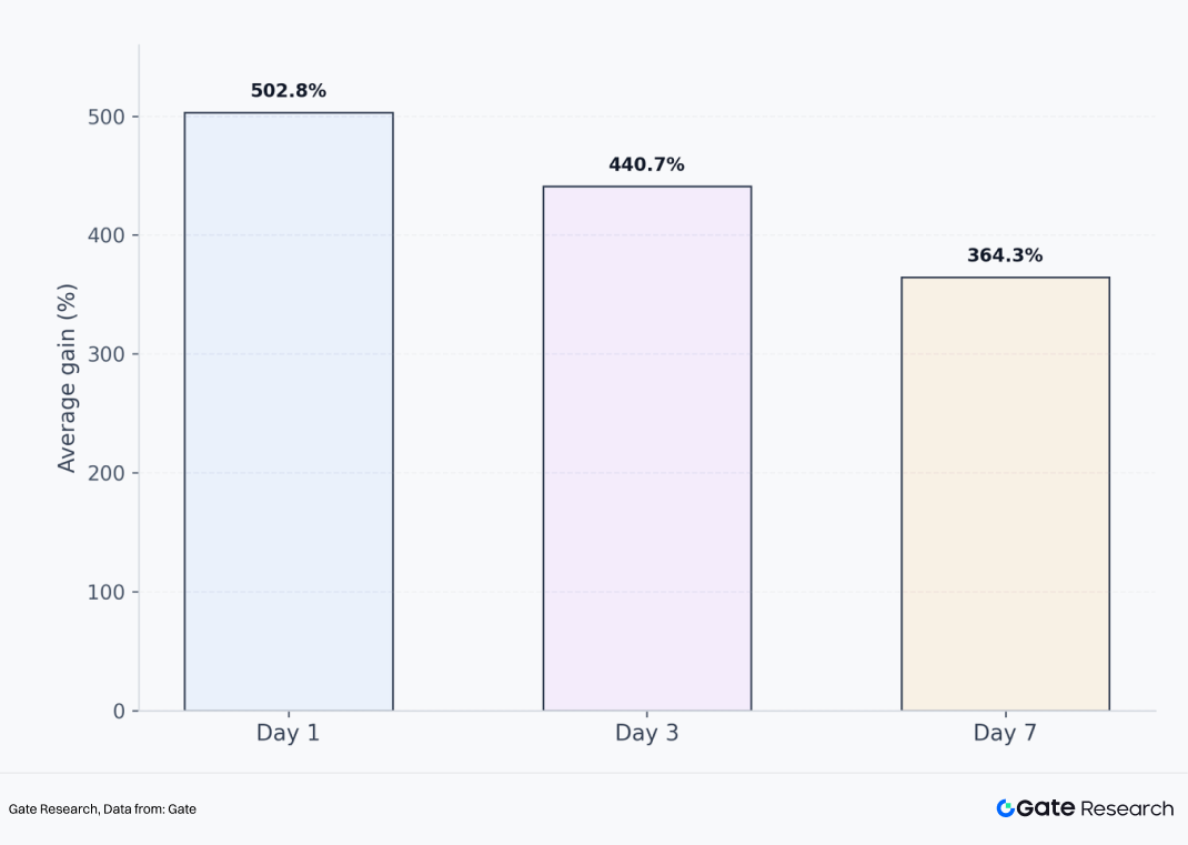 从表现看,首发项目最突出的特点是收益弹性大。数据显示,近 46% 的首发项目在上线 7 日后仍保持上涨;上涨项目在首日、3 日和 7 日维度的平均涨幅分别达到 502.8%、440.7% 和 364.3%。这意味着,Gate 首发项目的核心优势,并不只是先上线,而是在于从 Gate 开始形成市场合力,往往能够迸发出更强的价格弹性。
