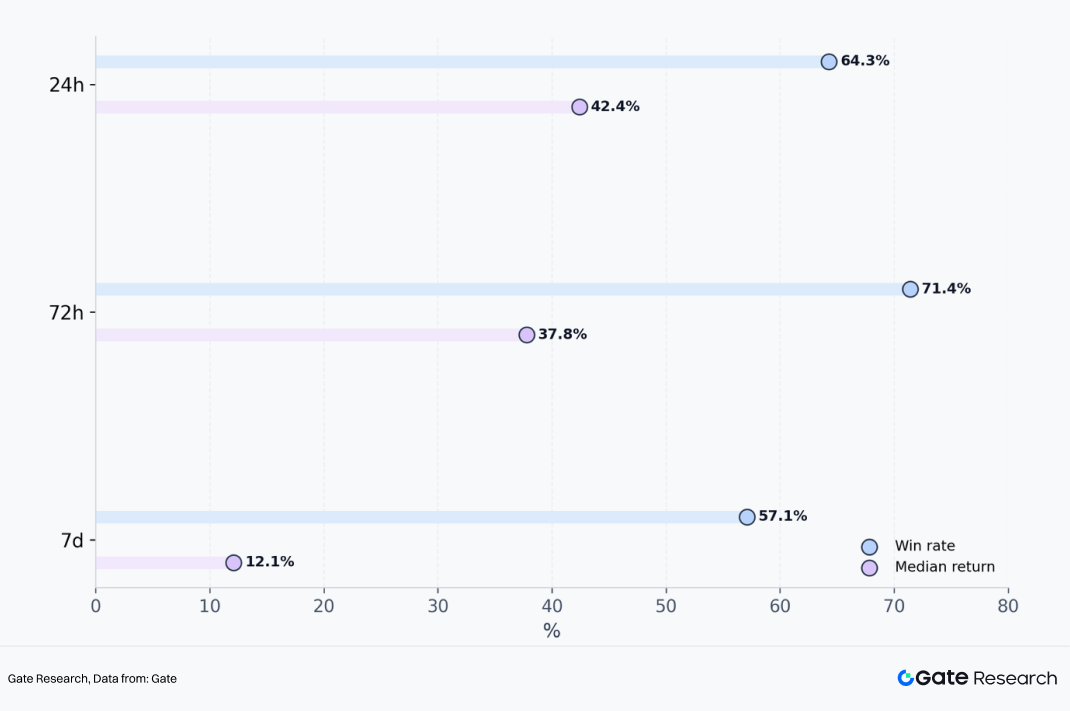 从胜率看,独家项目在 24 小时、72 小时和 7 日维度的上涨成功率分别达到 64.3%、71.4% 和 57.1%。其中,72 小时窗口表现最为突出。也就是说,在上市后第 2 天到第 3 天这段时间里,Gate 独家项目并没有随着开盘热度消退而迅速走弱,反而形成了更清晰的市场资金承接和上涨效应。