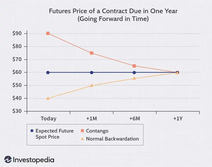在常规情况下,远月合约意味着油商会把油往后多放几个月,产生额外的仓储成本,所以交货价格理应更贵,市场把未来的合约比近月贵的现象叫作 Contango(期货升水),与之相反,市场把近月比远月贵的情况叫作 backwardation(现货溢价)。这通常出现在眼下更缺货、大家更想要现在就拿到油的时候。