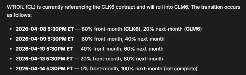 根据 Tradexyz 文档中的说法,预言机会用 5 个交易日的时间,将价格权重从 100% 近月合约逐步切换到 100% 远月合约。