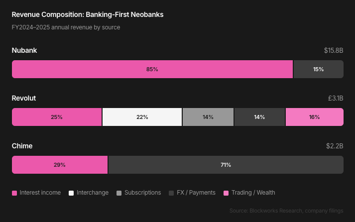 首先是经济方面。76% 的传统新银行无法盈利。最终跑出来的玩家(Nubank、Revolut、SoFi)并非依靠刷卡消费获利,而是通过信贷业务与净利息收入实现盈利。交易费只是入场券,信贷才是核心业务。