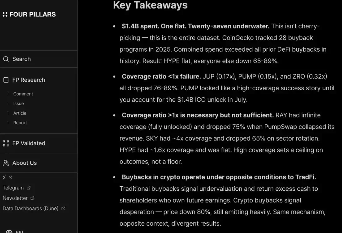传统公司回购股票,通常是在增长投资机会减少、或股价被低估时进行;而加密项目的回购,往往是在散户和市场舆论压力下被迫「即时执行」——这种压力本身高度情绪化且不稳定。你可能刚刚拿出 1000 万美元用于回购,本可以用于再投资,结果第二天就因为某个做市商被强平而被市场完全吞没。