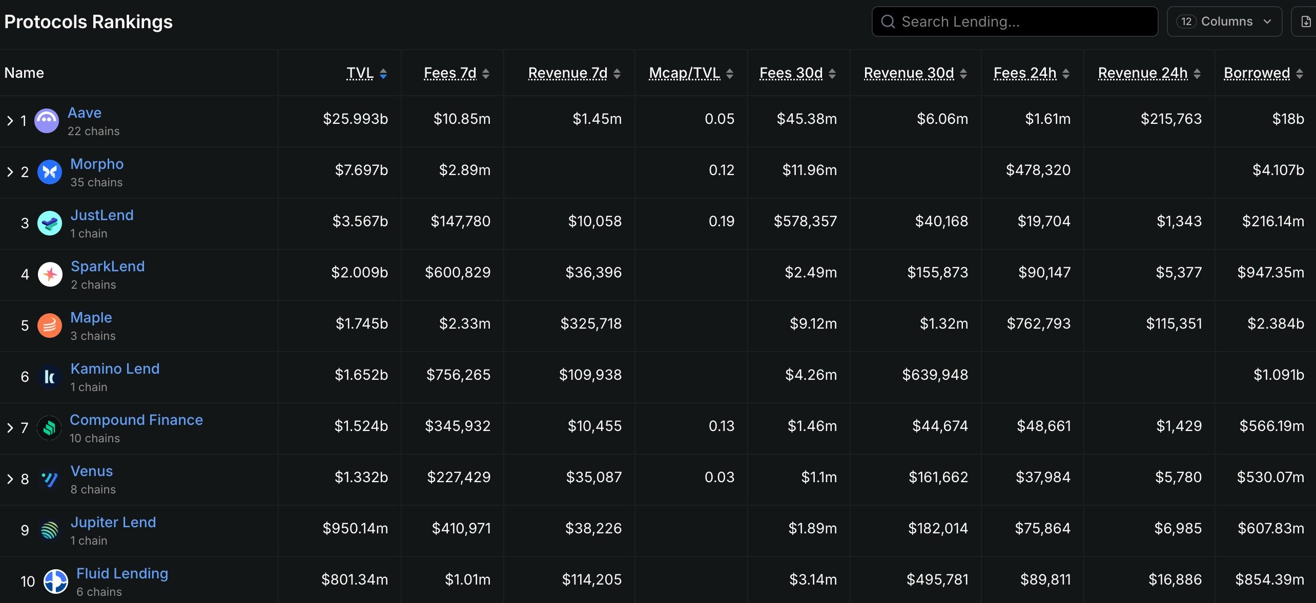 链上借贷市场的竞争格局呈现出典型的”一超多强”特征。Aave以约329亿美元的TVL占据绝对主导地位,这一数字不仅领先第二名Compound(TVL约26亿美元)十余倍,更占据了借贷赛道总TVL的50%以上。然而,Aave的护城河并非来自网络效应或品牌认知——这些在开源协议世界几乎不值一提——而在于其持续的技术迭代和生态扩展能力。从Aave V1的浮动利率模型,到V2引入的信用委托和闪电贷,再到V3的Portal跨链流动性和隔离模式,Aave每代产品都精准命中市场痛点。V4版本预计将在2026年中期上线,进一步强化跨链清算能力和机构级合规框架。在Aave的阴影下,一批差异化协议正在寻找自己的生存空间。Morpho Labs走了一条独特的进化路径——最初作为AAVE和Compound的优化层(通过P2P匹配提升资本效率),后来逐步发展出独立的Morpho Blue(无预言机、无治理借贷)和Morpho Vaults(专业风险策划者管理的收益策略),逐渐从”优化层”转变为”独立协议”。Spark Finance则依托MakerDAO的DSR(DAI储蓄率)生态,在稳定币借贷领域建立了稳固的用户基础,其与Aave V3的技术协同使其成为机构入场的重要通道。