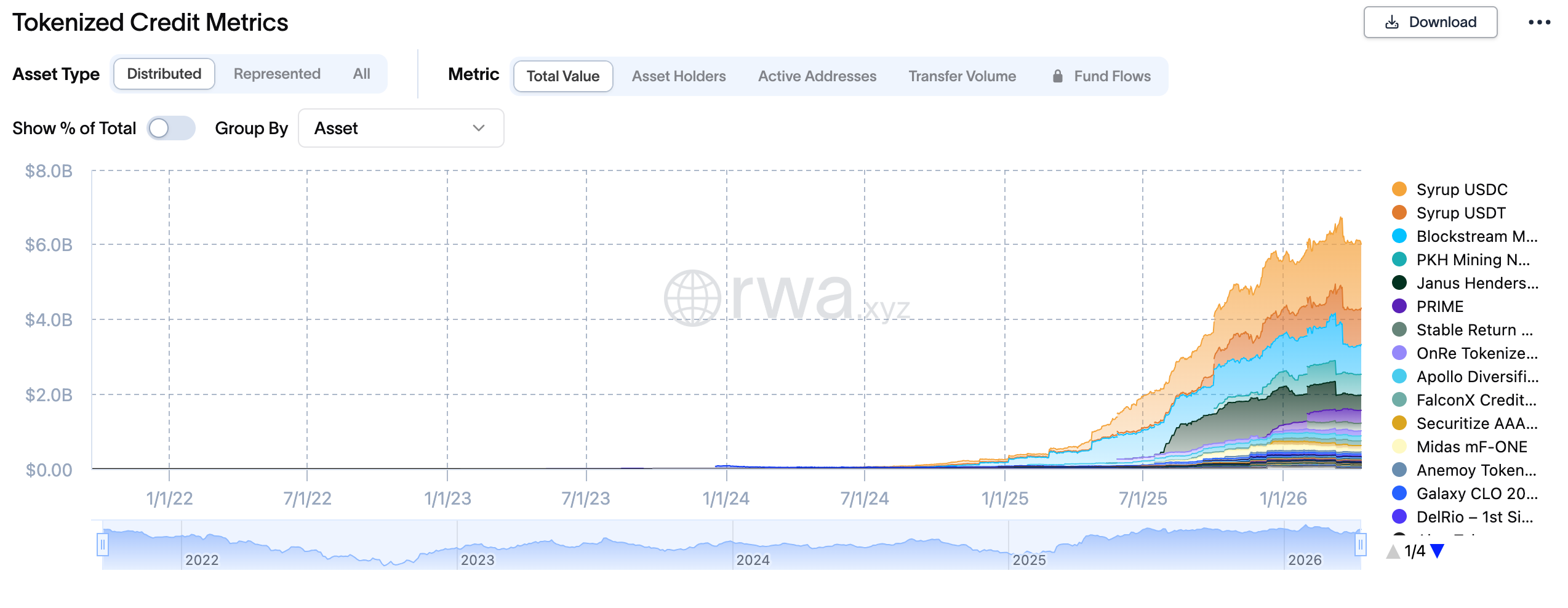第二股力量是RWA借贷的爆发式增长。2024年初,BlackRock的代币化基金BUIDL规模突破50亿美元,Ondo Finance的OUSG(美债收益代币)规模突破10亿美元——这些合规资产开始被引入链上借贷协议作为核心抵押品。相比ETH、BTC等加密资产的剧烈波动,美债具有波动性低、流动性好、监管合规的三重优势,成为机构资金进入链上借贷的”绿色通道”。Maple Finance、Pendle和Flux Finance等协议已支持以代币化美债作为抵押品进行借贷,用户可以用美债头寸获得流动性,同时保留美债的收益。Aave则在V4版本中专门设计了面向RWA资产的”机构市场”(Horizon Institutional Market),为注册在SEC框架下的合规借款人提供链上借贷服务。截至2026年初,链上RWA借贷规模已突破185亿美元,预计到2027年将超过500亿美元。