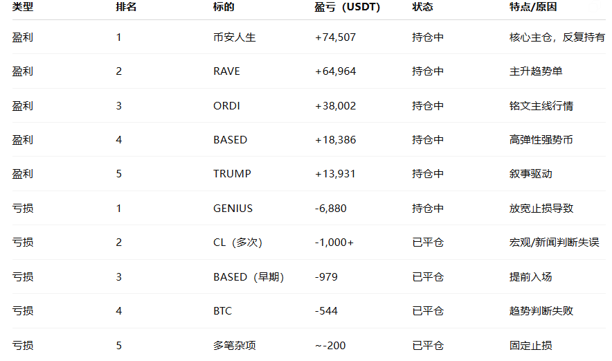 从交易记录来看拉哪并不对市场行情进行预测,只做跟随,也就是趋势行情,专注于捕捉已经启动的币种。涉及标的包括:币安人生、RAVE、ORDI、BASED、TRUMP、SIREN、1000SATS、1000RATS、EIGEN、PIXEL、EDGE、BAN、ASTER、AIA、FIGHT、GENIUS、CL、BTC、GIGGLE、HYPE、BLESS、PUMP、HEMI、CFX。