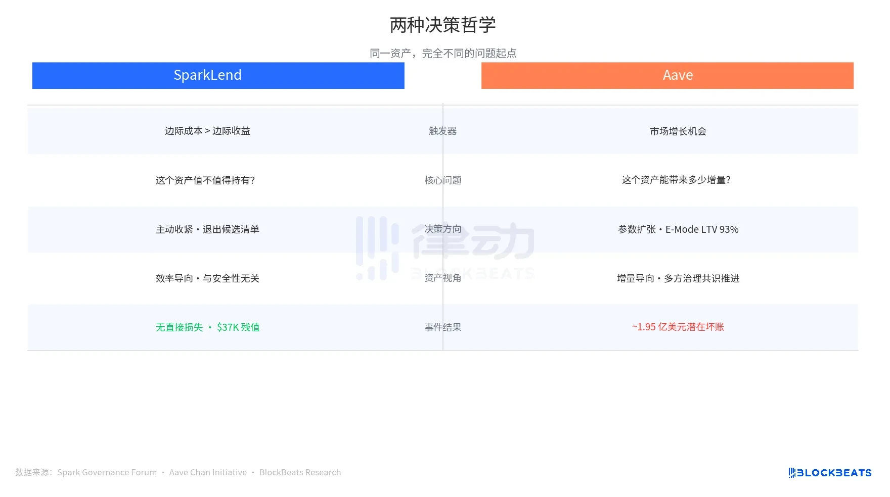 两个协议在同一天做出了方向相反的决定,不是说 Spark 和 Aave 谁做了正确的决策,两套体系的问题起点完全不同。