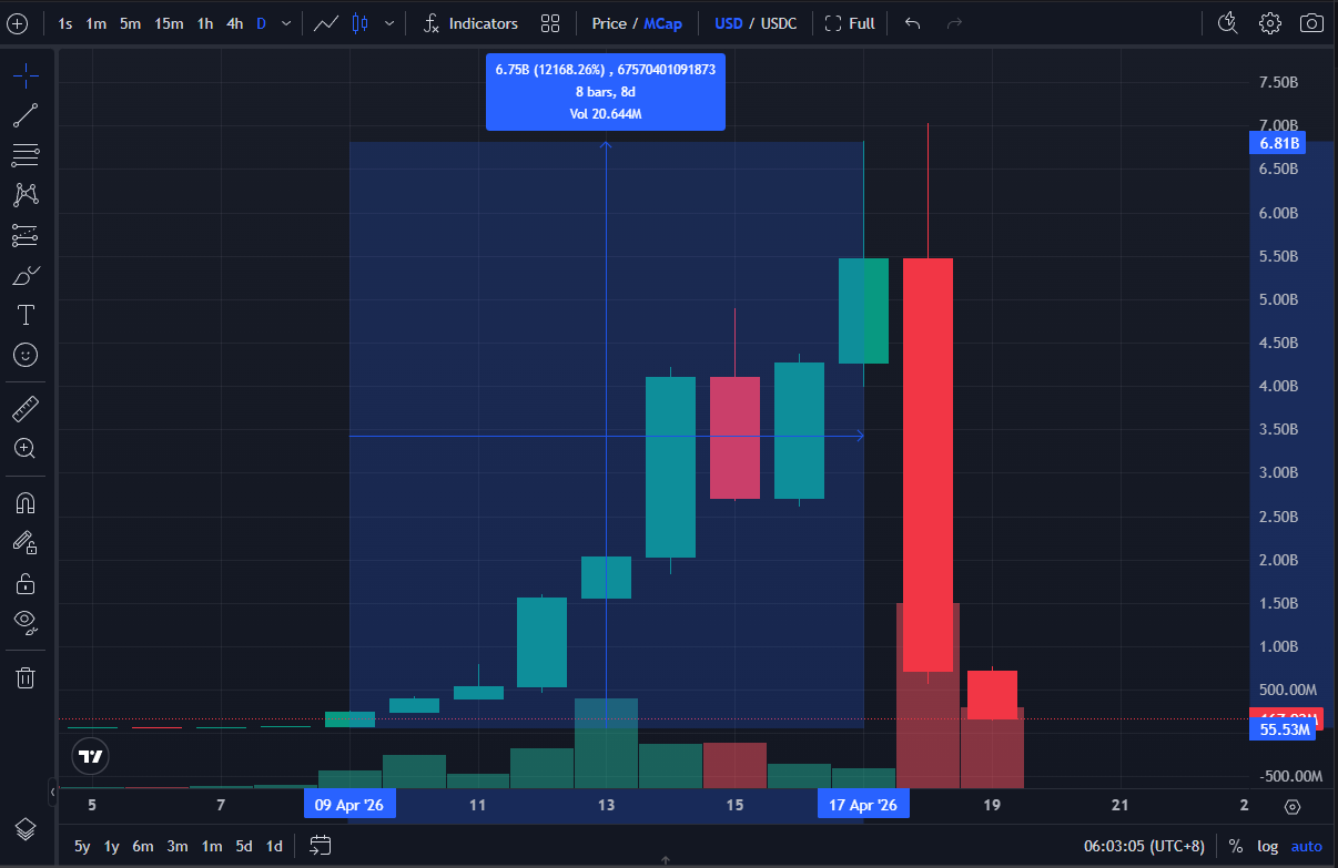 就在市场还沉浸在这场持续逼空的狂热中时,RAVE 的市值一度逼近 70 亿美元。几乎所有人都知道,这样的走势终究会有一个崩盘的时刻,只是没人确定会在什么时候、以什么方式发生。