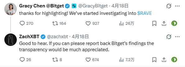 事件随即快速发酵。最先做出回应的是 Bitget。19:18(北京时间),Bitget CEO Gracy Chen 表示:“感谢指出这一问题,我们已经开始对 RAVE 代币展开调查(Thanks for highlighting! We’ve started investigating into $RAVE)”,确认平台已启动相关调查。