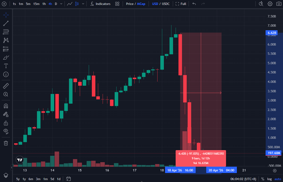 无论是社交媒体、交易群,还是各类行情复盘,大家的关注点、吐槽点,甚至情绪宣泄的出口,几乎都围绕着它展开。原因也很简单:这个币的走势,实在太“妖”。从 0.22 美元一路拉升至 28 美元,短短一周多的时间,涨幅超过百倍;而就在上周末,行情突然反转,在不到 24 小时内从高位跌至 1 美元附近,跌幅接近 95%,目前仍在持续下跌。