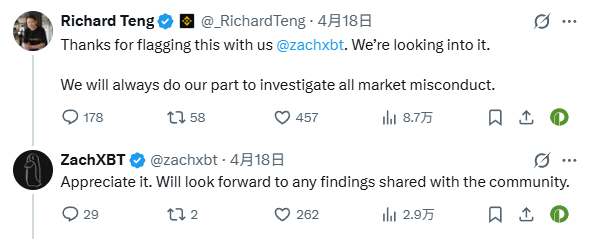 随后,币安方面也给出表态。22:08(北京时间),Binance 联席 CEO Richard Teng 回应称:“感谢你提醒我们这一情况,我们正在对此展开调查,并会持续打击所有市场不当行为(Thanks for flagging this with us, we’re looking into it. We will always do our part to investigate all market misconduct)。”