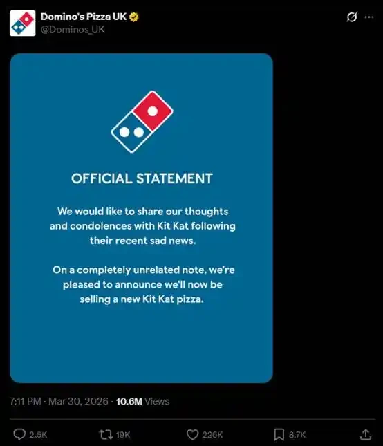 别的品牌也参与到「KitKat 大劫案」中,以 meme 的方式进行跨品牌互动。比如 Domino』s 的英国 X 账号,就开玩笑地宣布他们将开始销售 KitKat 披萨,推文获得了 22.6 万点赞,1.9 万转发。