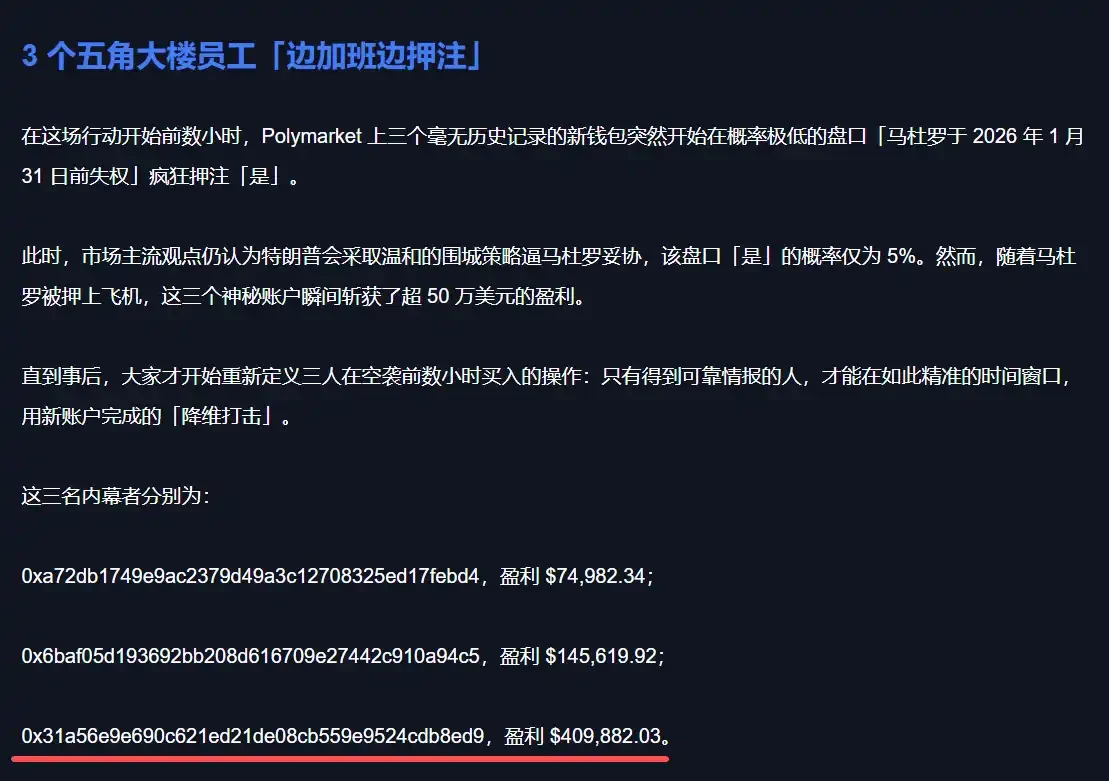 据报道,Van Dyke 在行动前夕通过预测市场押注马杜罗将被抓捕,赚了超 40 万美元。报道虽未公开具体的账户信息,但通过其中提及的押注方向和盈利数额,我们比对到了账户 0x31a5。