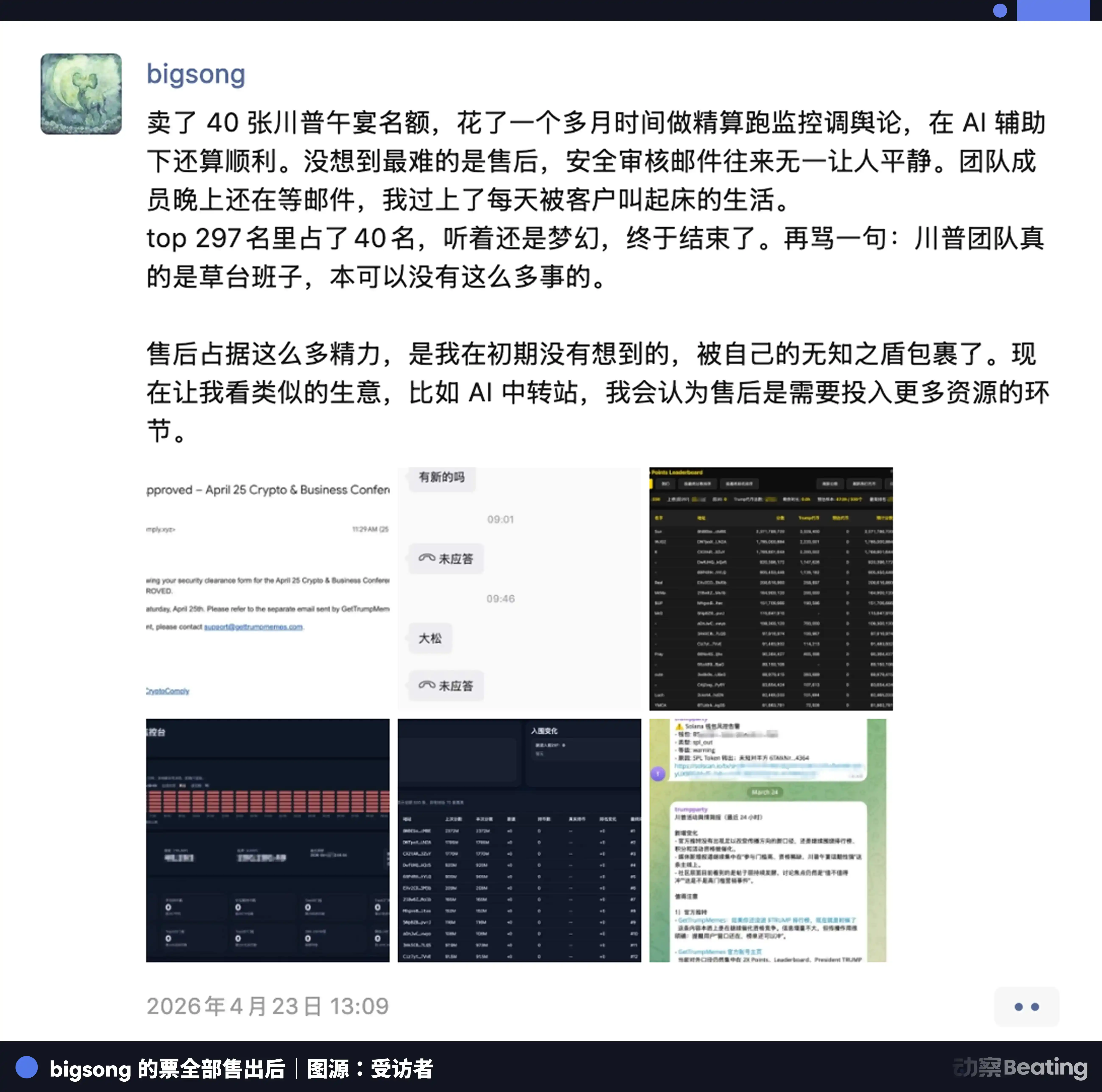 特朗普的商业合作伙伴赞克尔说,他要说服总统每六个月办一次。bigsong 明年或许也要做「包过套餐」,不仅帮买票的人拿到积分排名,还会帮持币人通过安全审查。Sherry 的群里,已经有人开始预定明年的票。供给侧和需求侧正在同步升级,一条从生产、销售、售后到复购的完整产业链成型了。