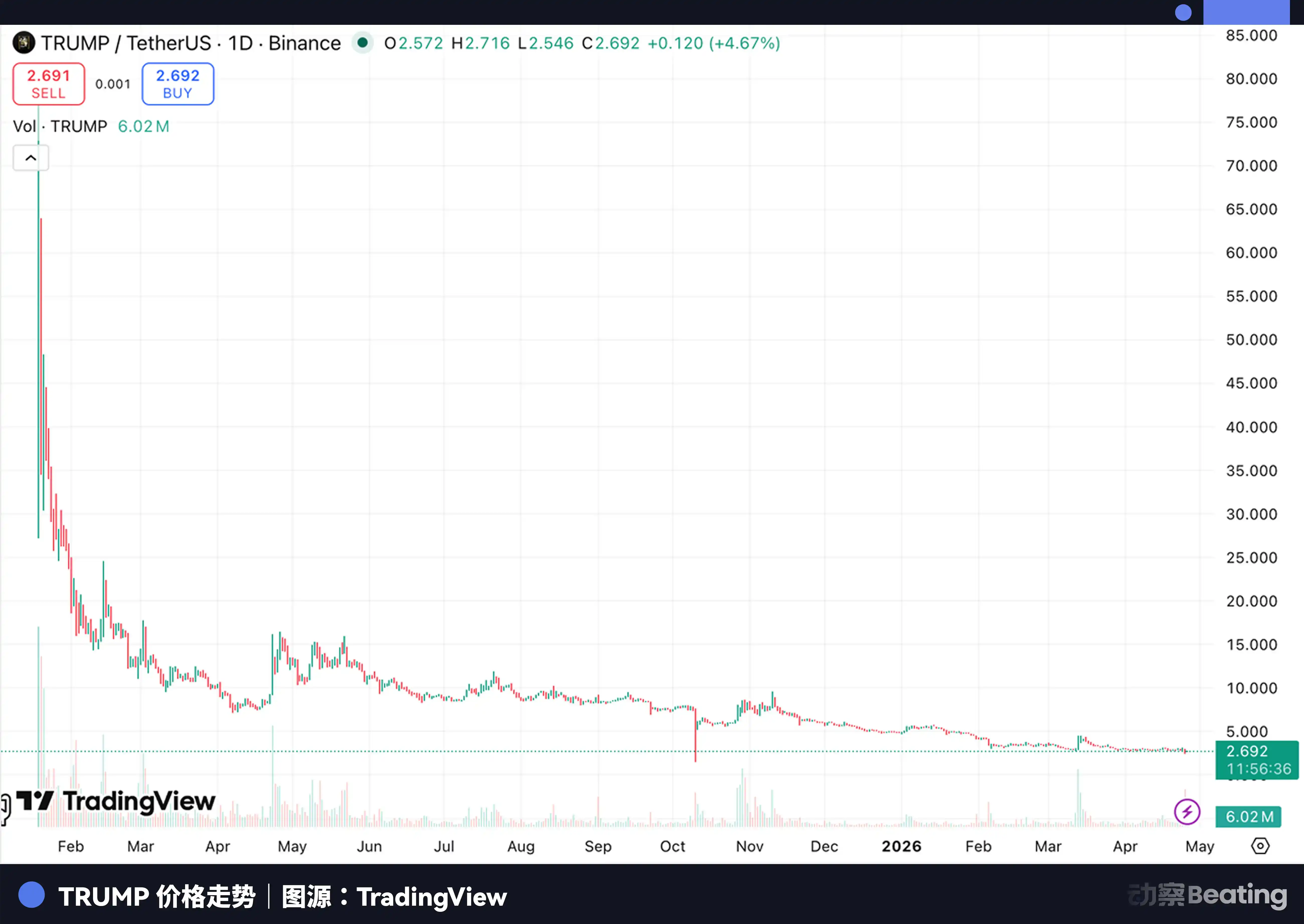 据 Forbes 估算,截至 2026 年 4 月,TRUMP 币的交易手续费已经为特朗普关联实体创造了近 4 亿美元的收入。币价从最高点跌去了 96%,他的家族实体控制着这枚币 80% 的供应量,但赚钱机器没有停过一天。