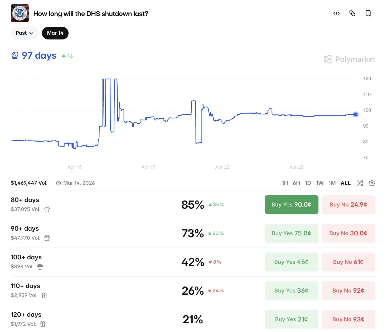 目前据 Polymarket「国土安全部停摆会持续多久?」的市场显示,国土安全部很大可能性还将停摆至少 20 天。