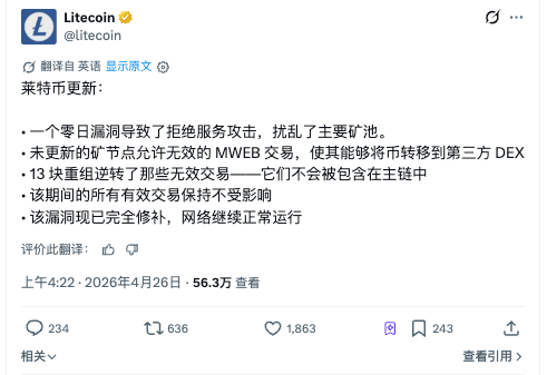 导读: 莱特币 4 月 25 日遭遇协调攻击,MWEB 隐私层漏洞被利用,攻击者在约 32 分钟内通过未更新节点执行无效交易并在跨链协议上实施双花,NEAR Intents 报告约 60 万美元风险敞口。网络执行 13 区块重组修复链状态,但安全研究人员发现该漏洞早在 37 天前就已被私下修补,「零日攻击」定性遭质疑。官方账号事后嘲讽批评者「待在浅水区」,引发社区强烈反弹。