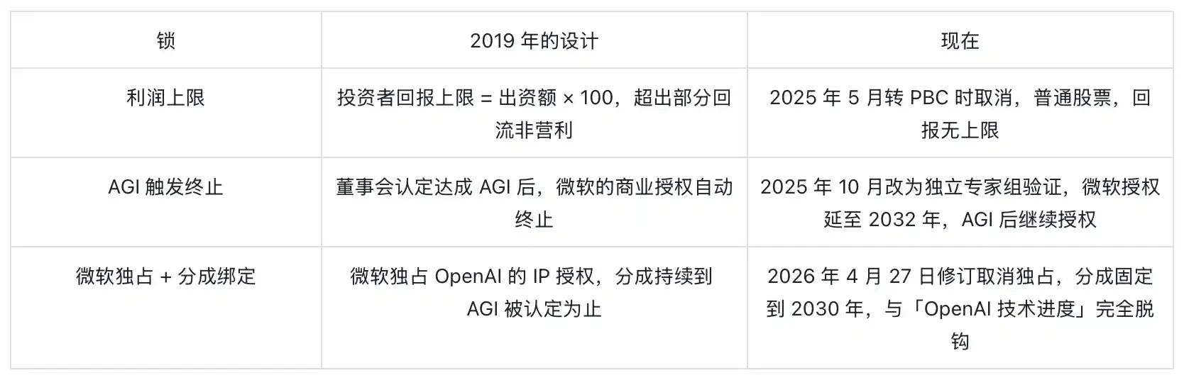 你会发现一件事。2019 年的 OpenAI,是在向捐助人证明「即使我们要赚钱,赚的也有限度,到了某个点必须停下」。2026 年 4 月 27 日的 OpenAI,是在向投资人证明「我们没有任何刹车」。