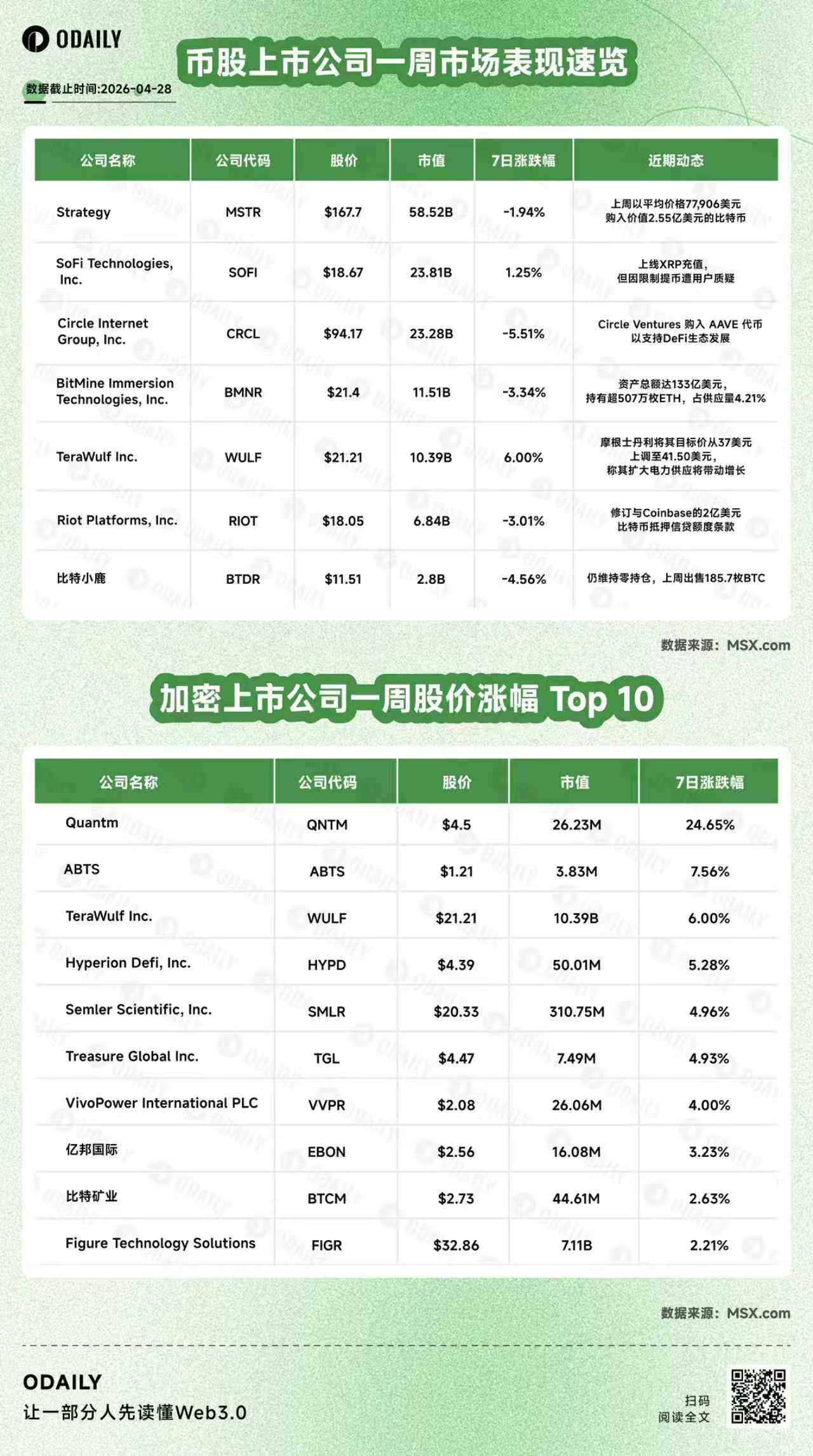 币股风向标丨Strategy上周投入2.55亿美元增持3273枚BTC;Bitmine资产总额达133亿美元,持有超507万枚ETH(4月28日)