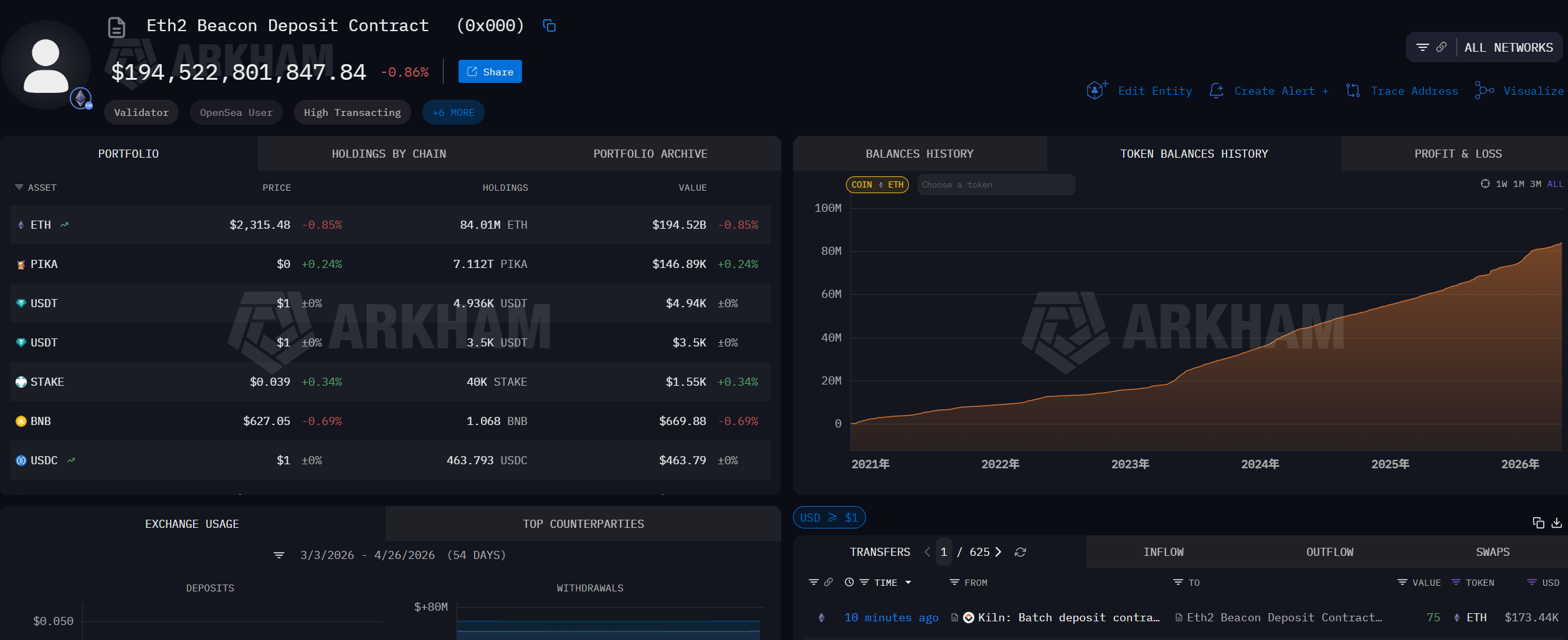 截至 4 月 24 日,BitMine 持有 4,976,485 枚 ETH,约占 ETH 总供应量的 4.12%,其中共质押 347.1 万枚 ETH,占其 ETH 总持仓量的 70%。
