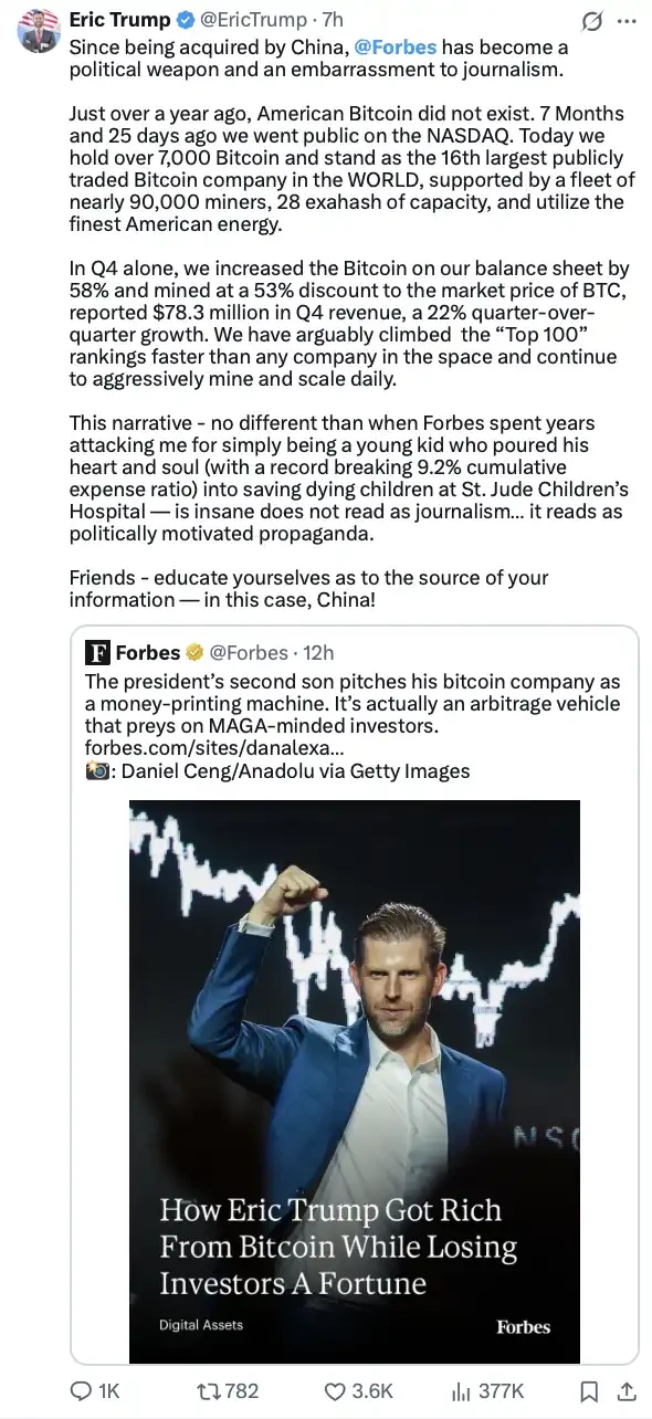 报道发出后,埃里克·特朗普在 X 上迅速还击,指控《福布斯》被中国收购,称报道是政治驱动的宣传,并搬出一串运营数据反驳:7000 枚比特币、近 9 万台矿机、四季度营收 7830 万美元。顺带,他还翻出二十年前为儿童医院募款的旧事,试图证明《福布斯》一直在针对他这样一个「好人」。